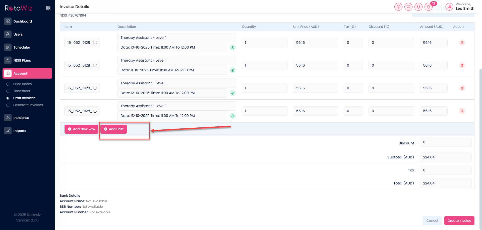 In the view detail tab you will find the drafted invoice where you will see the option of add shift and you can add the shift from there.