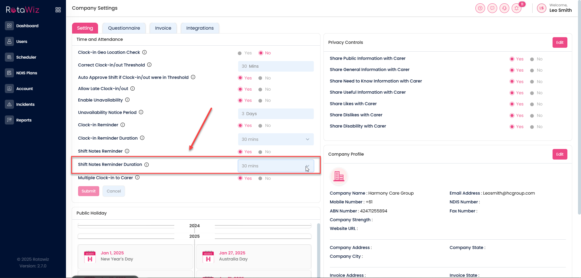 - Select the reminder time you want staff to receive for shift notes