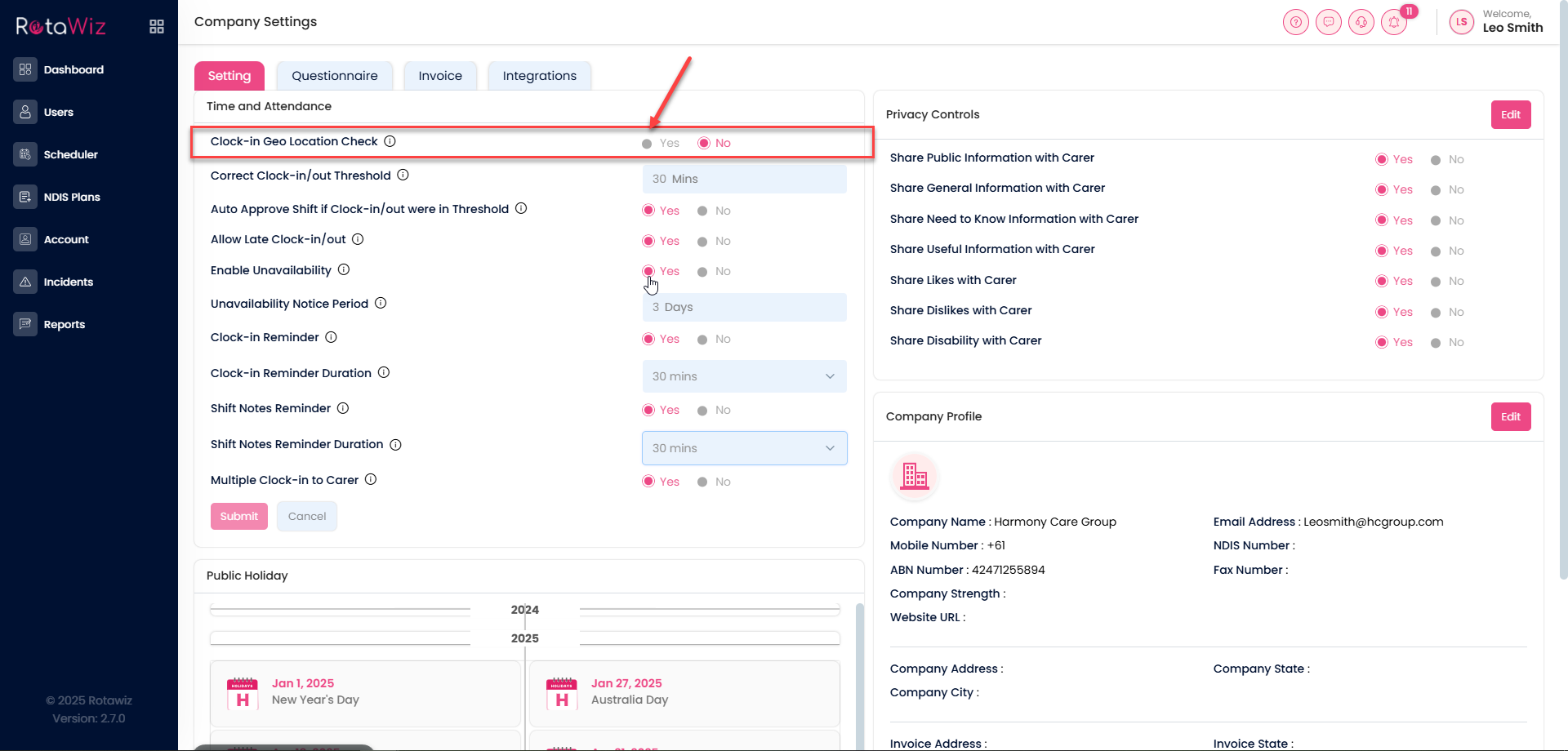 - Find the option called Clock-in GeoLocation Check and switch it from No to Yes