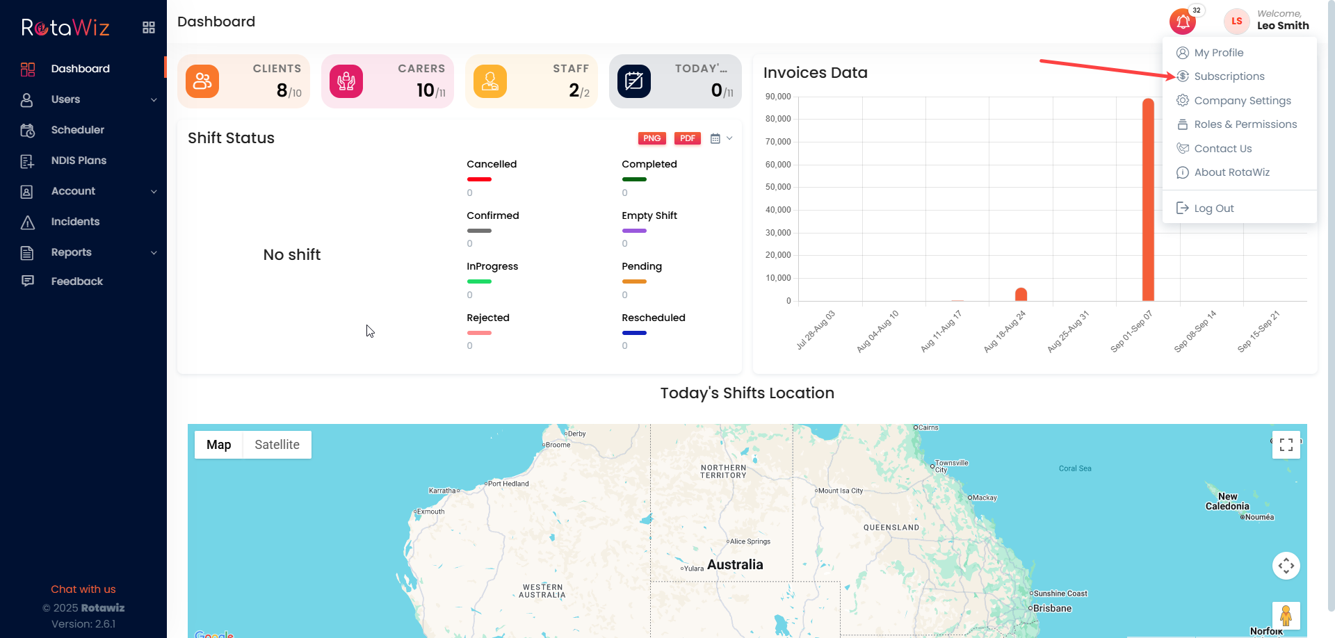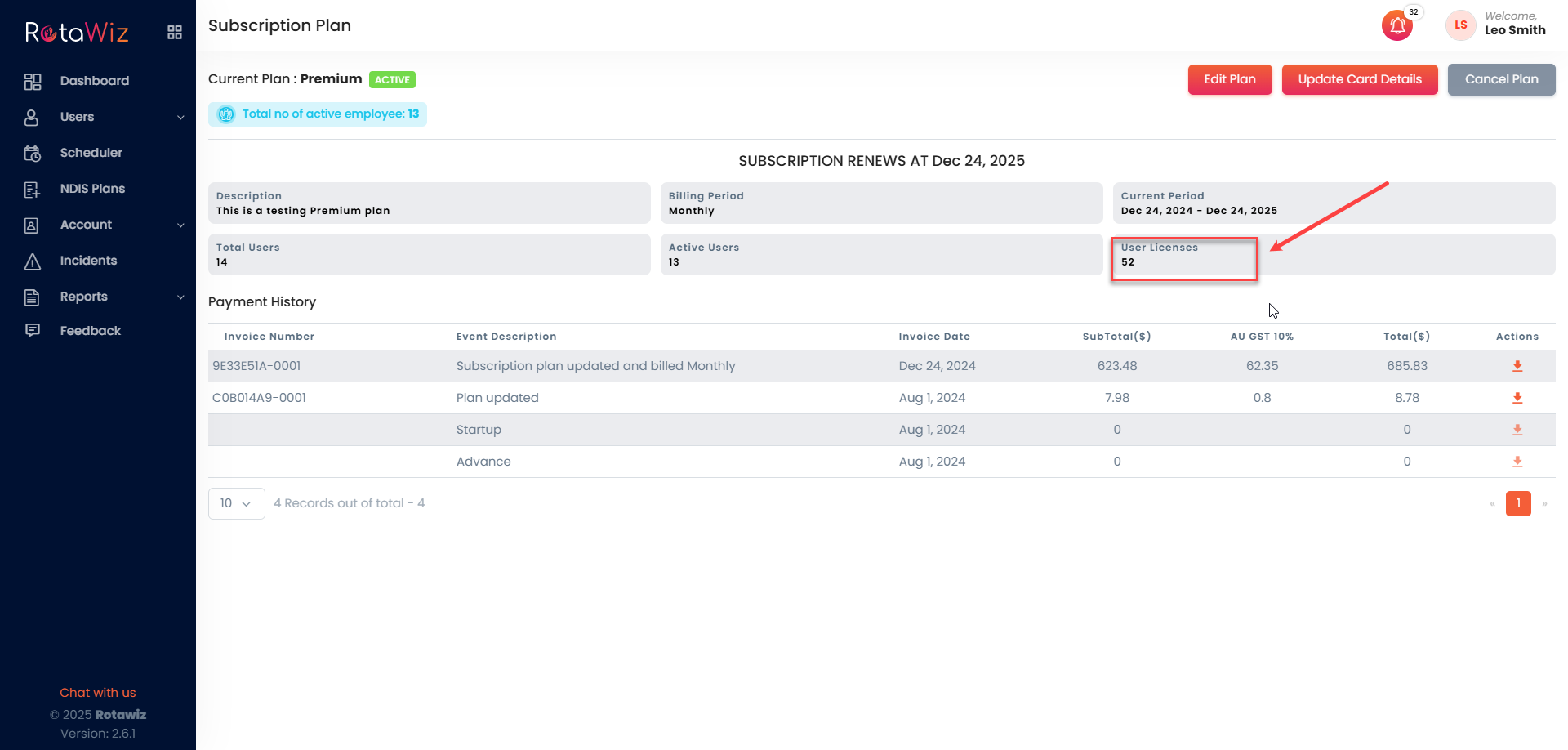 You can quickly check your current licenses:Click your name in the top right corner and select Subscription.