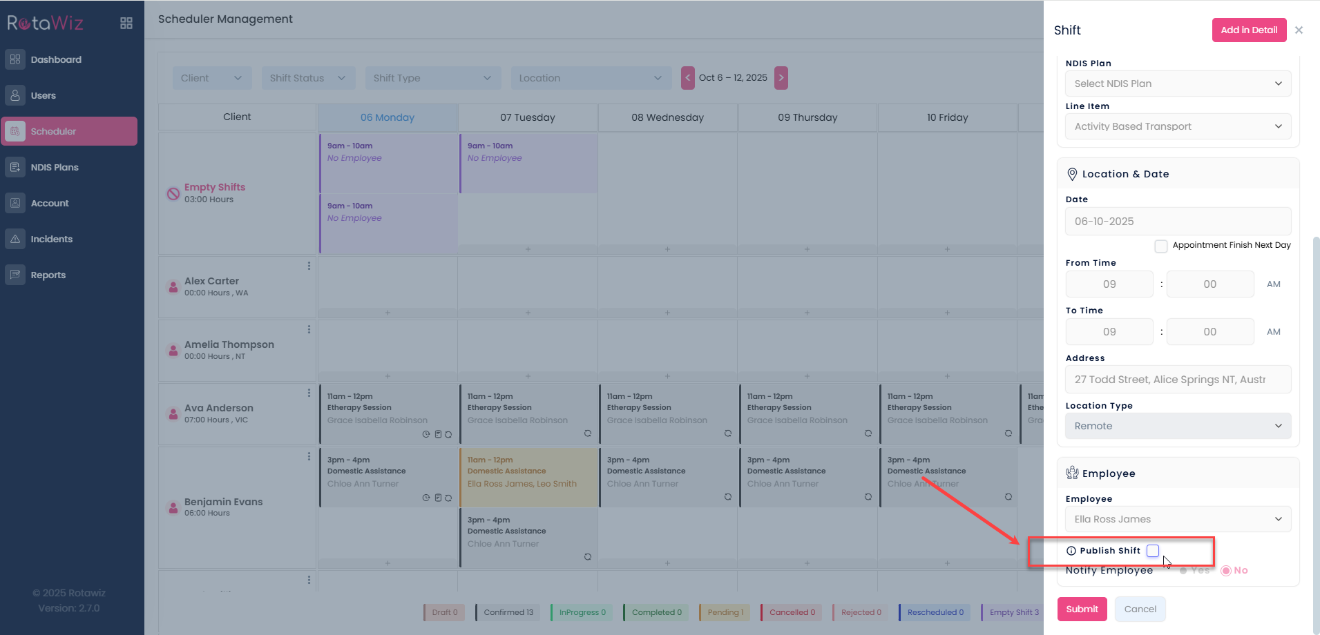 In RotaWiz, every shift you create is considered a draft shift by default. A shift only becomes published if you directly select the Publish option while creating it.