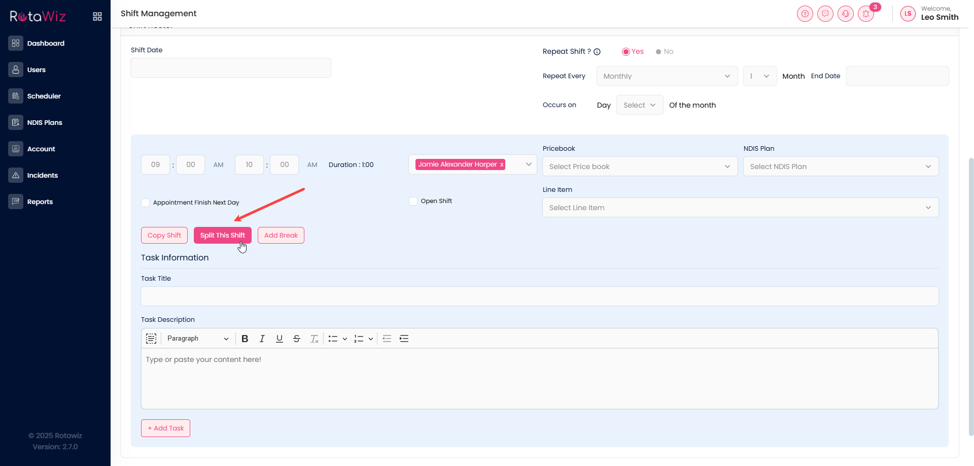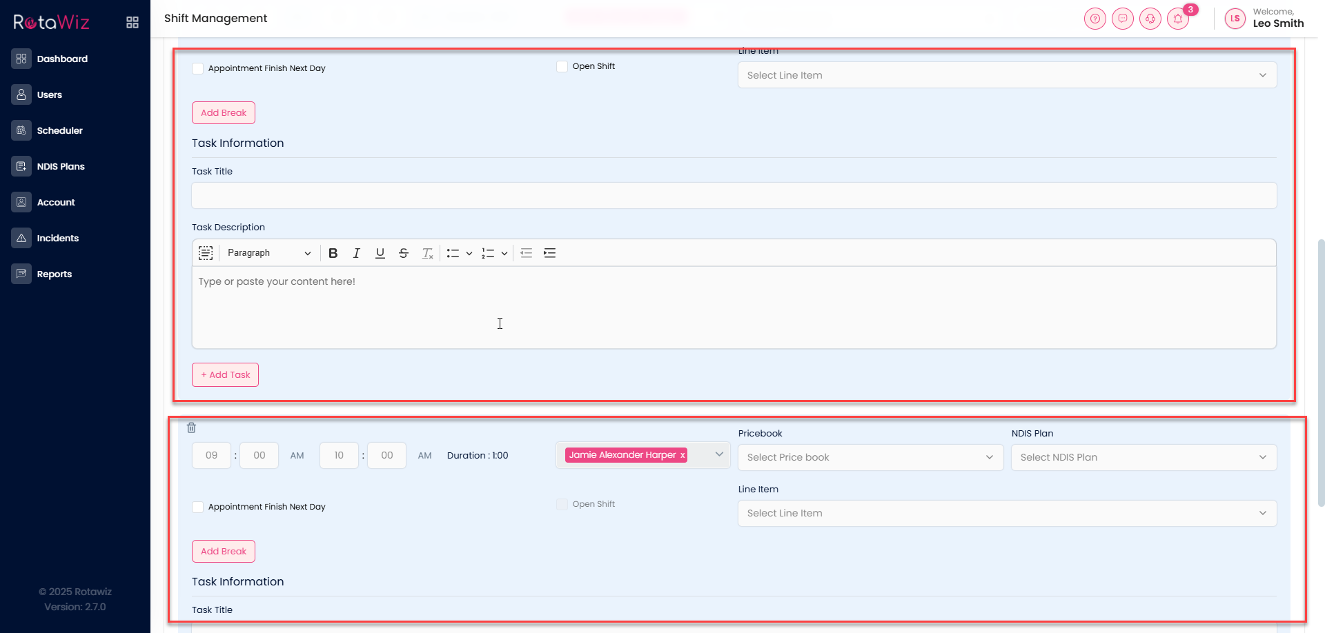 This allows you to schedule shifts in separate segments, making rostering more flexible for both staff and clients