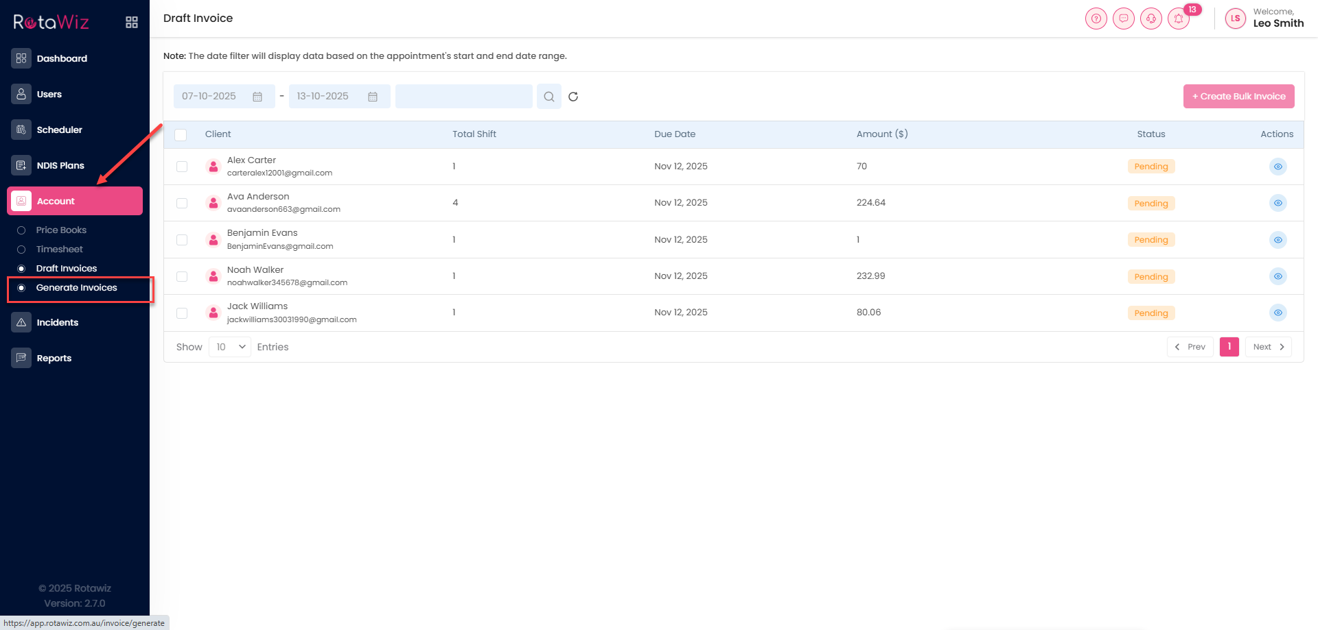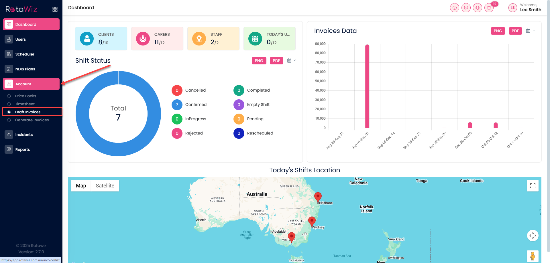 - From the Side Navigation Menu, click on “Draft Invoices”.