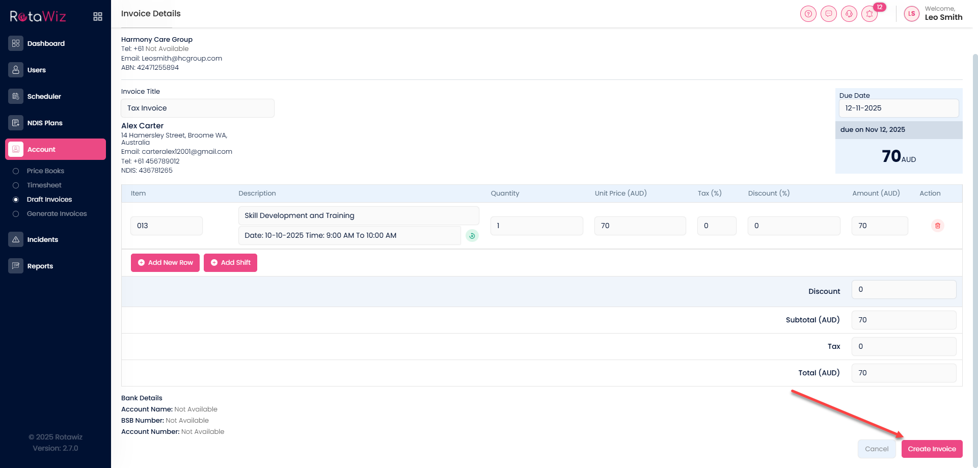 - Click on the “view details icon” of the shift for which you have to generate the invoice.