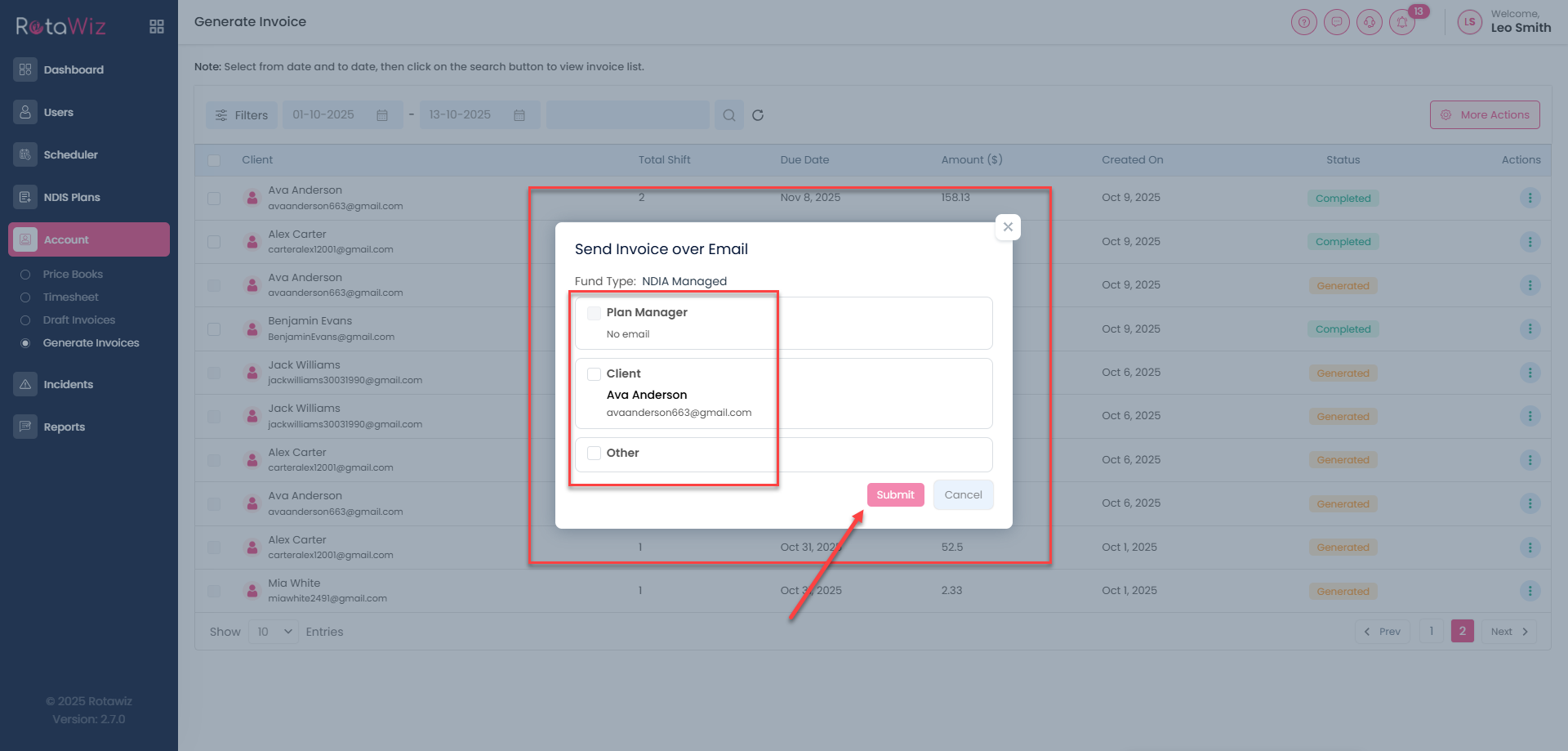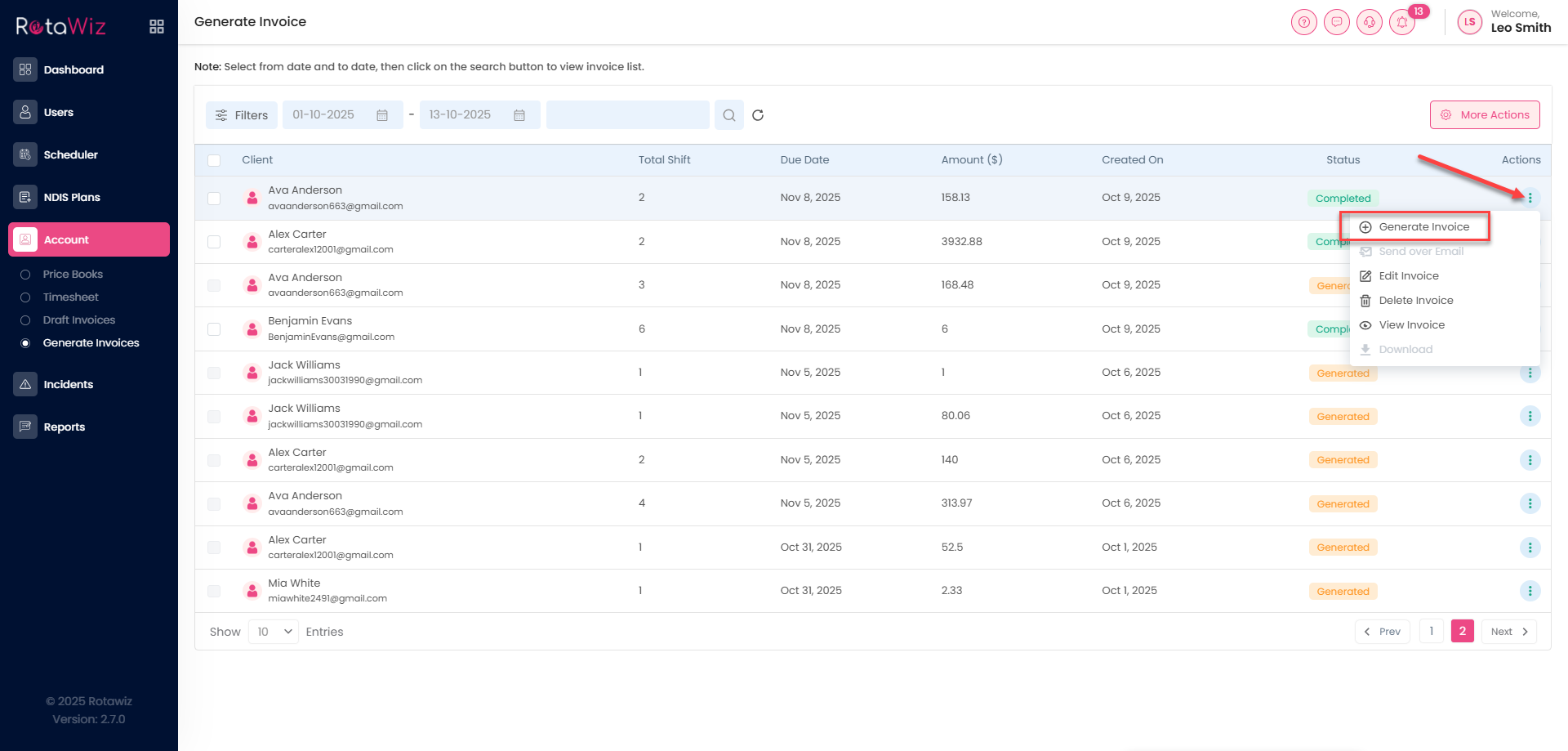 - After generating the invoice the status will be changed and when you click on the 3 dots you can download the invoice, can send over email and can view the invoice, also when you want to send over email you can send to the people accordingly.