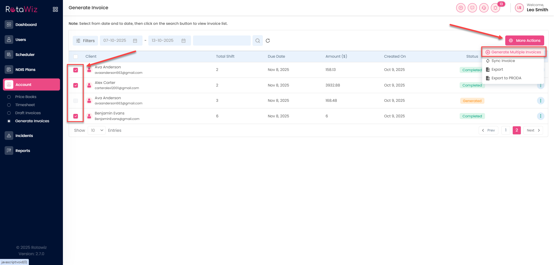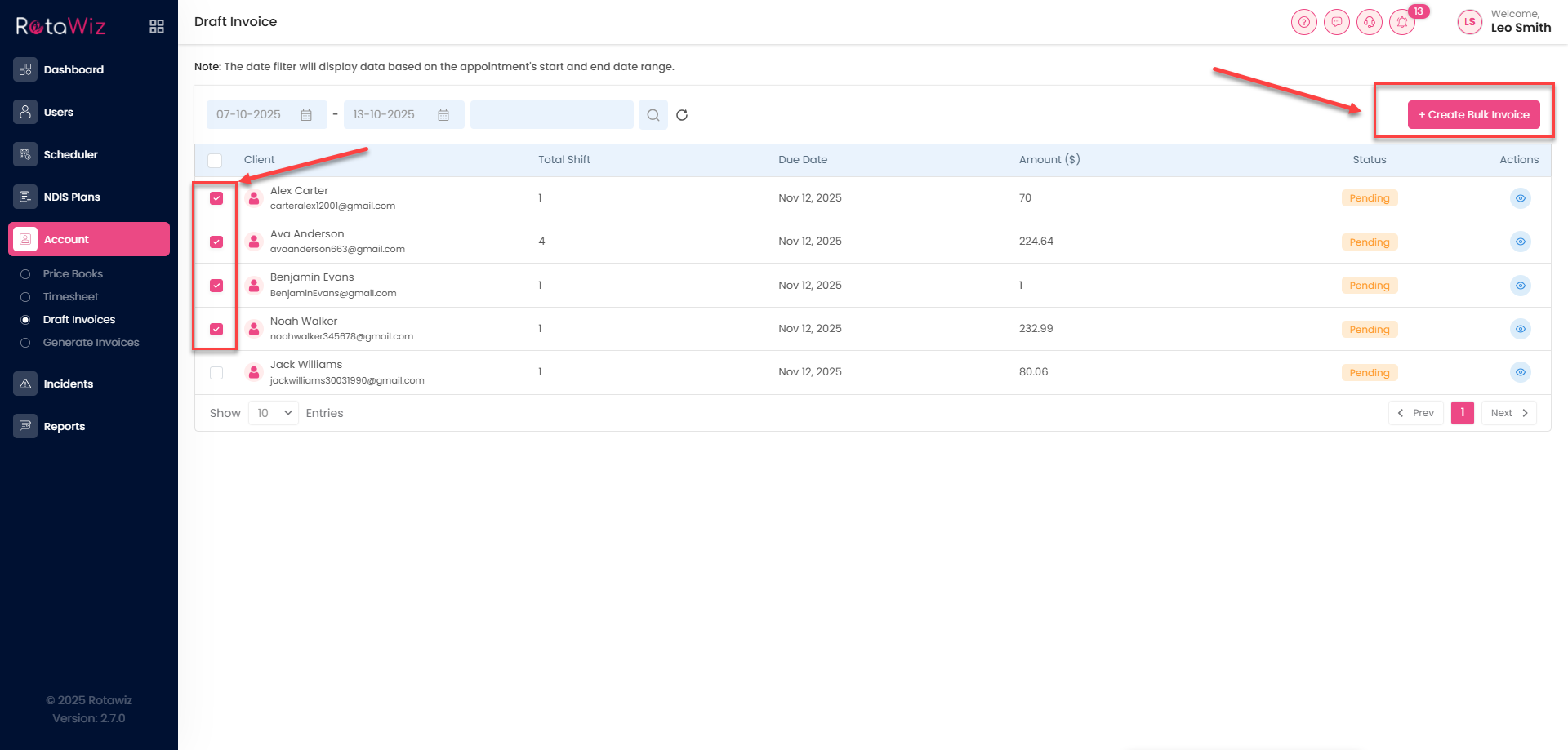 - Use the filters and select the dates or the shifts whose bulk invoice you want to generate,