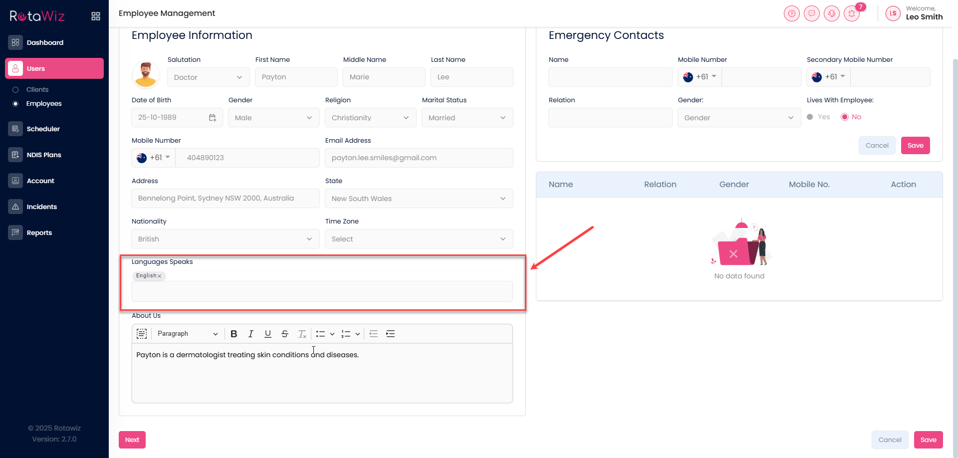 You can easily add the languages that a staff member speaks to their profile. Follow these steps
